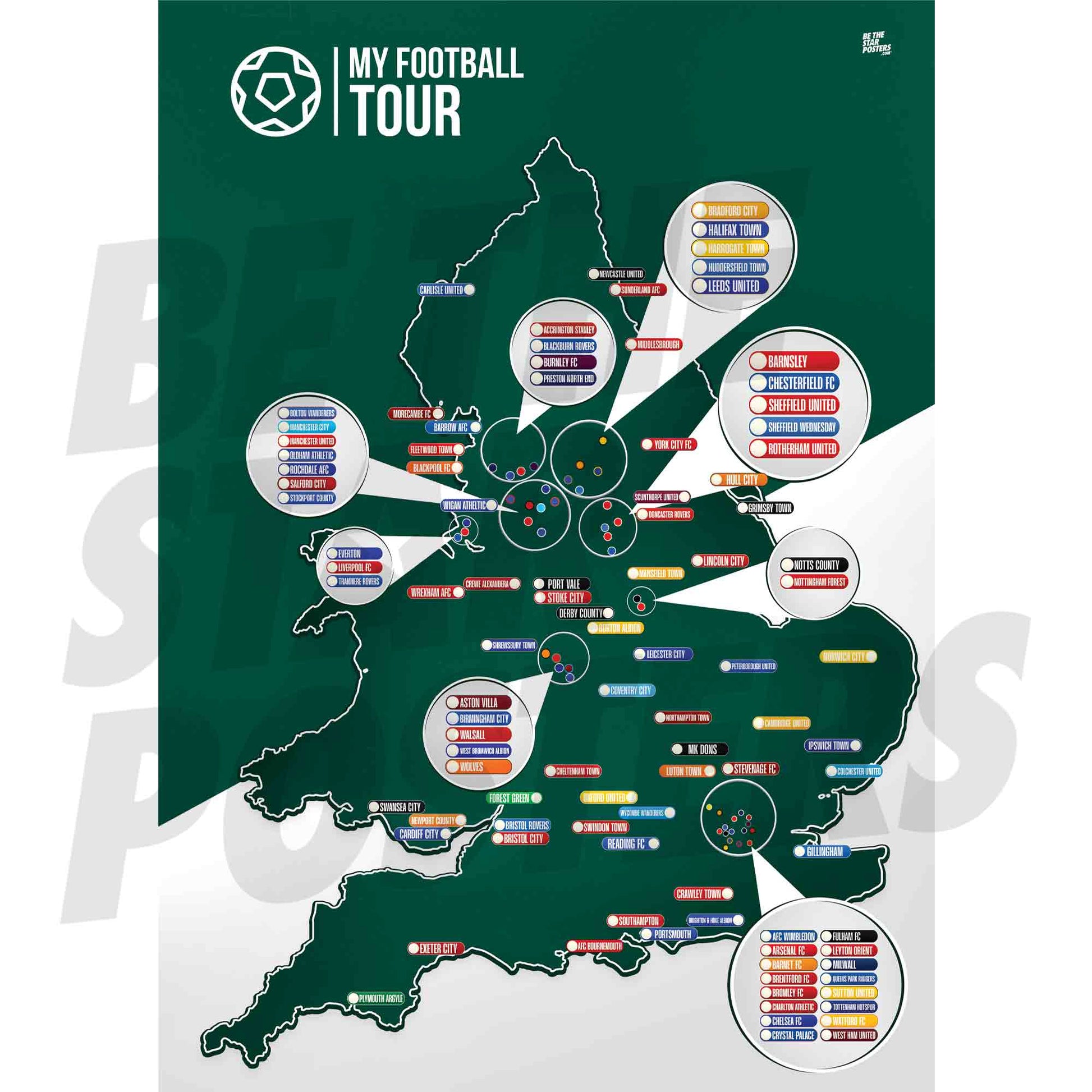 Each of the current 92 teams in the PL & EFL are present on our map of England & Wales that can be customised as you wish - Plus 8 from the National League to showcase 100 teams and give longevity to the product.